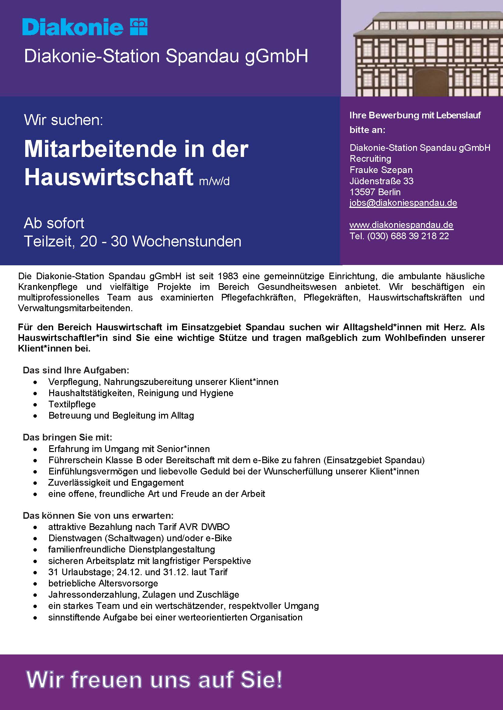 - Hauswirtschaft m/w/d, Teilzeit 20-30 Wochenstunden